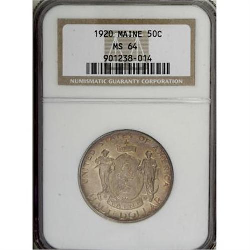 <B>1920 50C Maine MS64 NGC.</B></I> . NGC Census: (1022/1042). PCGS Population (1135/1195). Mintage: 50,028. Numismedia Wsl. Price for NGC/PCGS coin in MS64: $258. (#9326)<BR><BR><b>Shipping:</b> Coins & Currency (<a target="_blank" href="http://www.heritageauctions.com/common/shipping.php">view shipping information</a>)