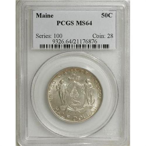 <B>1920 50C Maine MS64 PCGS.</B></I> PCGS Population (1137/1196). NGC Census: (1022/1043). Mintage: 50,028. Numismedia Wsl. Price for NGC/PCGS coin in MS64: $265. (#9326)<BR><BR><b>Shipping:</b> Coins & Currency (<a target="_blank" href="http://www.heritageauctions.com/common/shipping.php">view shipping information</a>)
