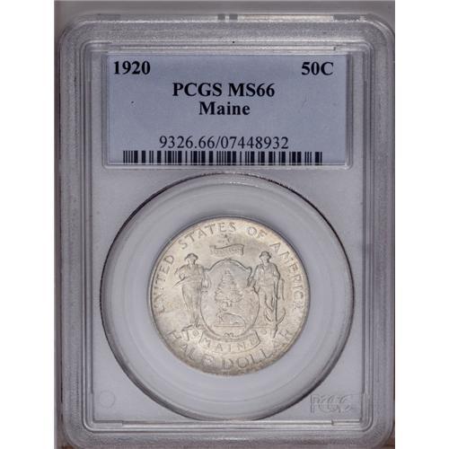 <B>1920 50C Maine MS66 PCGS.</B></I> Satiny luster with a light golden patina on this popular commemorative, the first in the series to celebrate a centennial. The focal-point obverse shield and other areas are remarkably free of bagmarks or other distractions, although this specimen does shows considerable evidence of die clashing and subsequent die lapping on both sides. An interesting and attractive piece, and one near the top of available representatives. PCGS has graded only 16 coins finer (12/05).