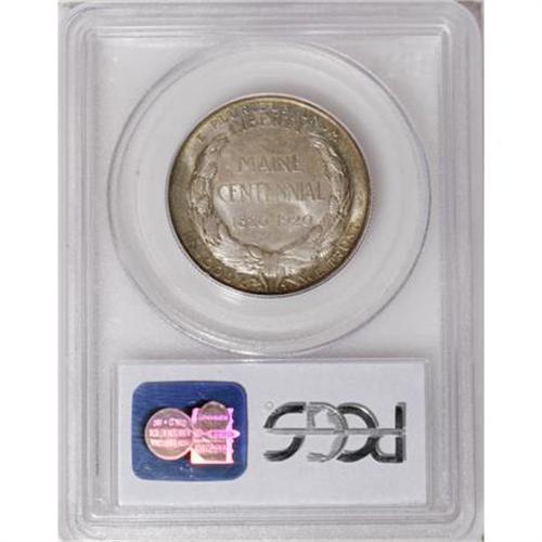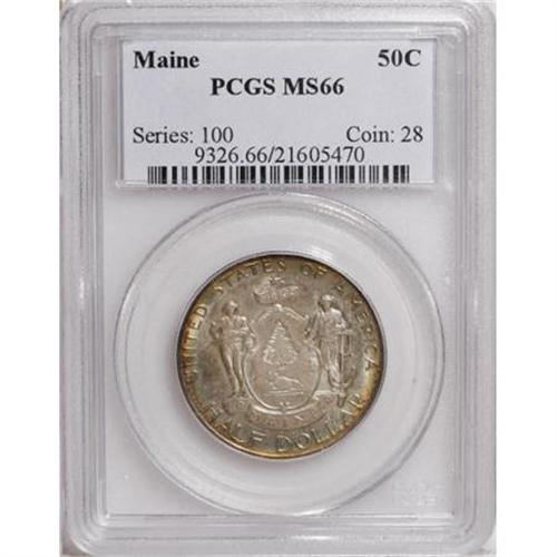 <B>1920 50C Maine MS66 PCGS.</B></I> Golden-brown and lime borders frame the pearl-gray centers. This sharply struck and satiny Premium Gem is well preserved and possesses exceptional eye appeal.<BR><I>From The Cary & Cheryl Porter Collection, Part Three.</B></I><BR><BR><b>Shipping:</b> Coins & Currency (<a target="_blank" href="http://www.heritageauctions.com/common/shipping.php">view shipping information</a>\)