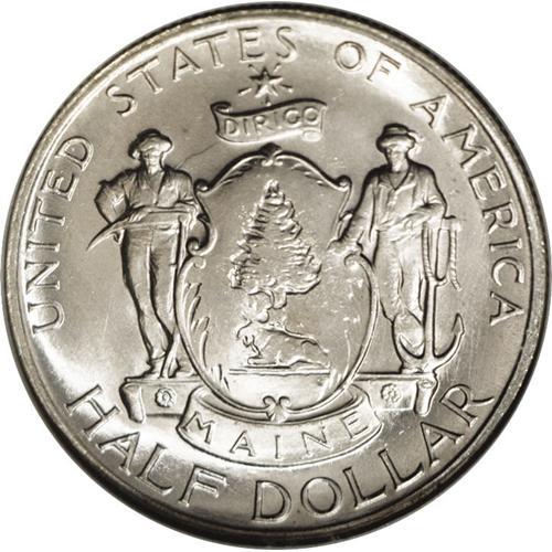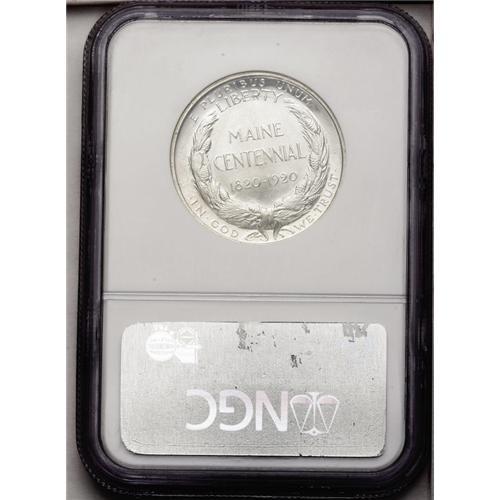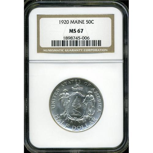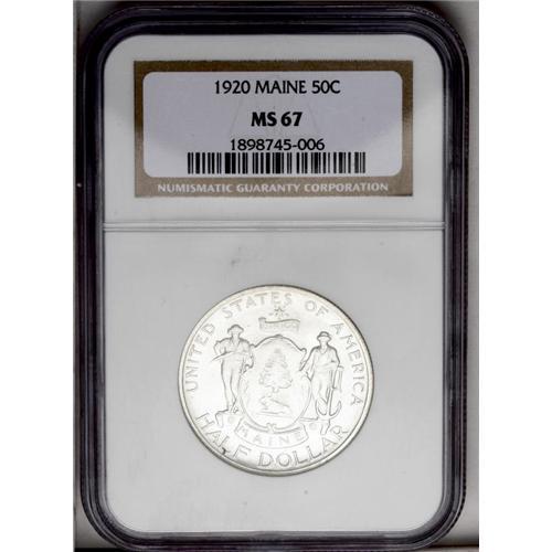 <B>1920<50C> Maine MS67 NGC.</B></I> David Bowers (1991) writes that the majority of the 50,000-piece Maine commemoratives that were distributed saw careless handling by the public. Examples in higher Mint State grades are thus much more elusive than the fairly generous mintage would indicate. Slightly more than 30 specimens have been certified MS67 by NGC and PCGS, and none finer. This coin is sharply struck on the design elements, and displays nice luster. Essentially untoned surfaces are devoid of significant marks. Moderate die polish lines are noted in portions of the fields of each side. Census: 16 in 67, 0 finer (3/06).