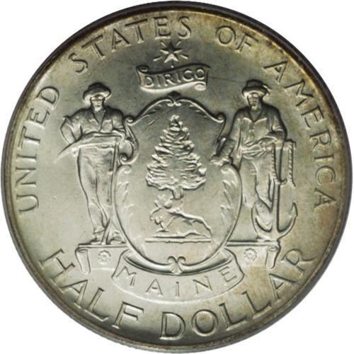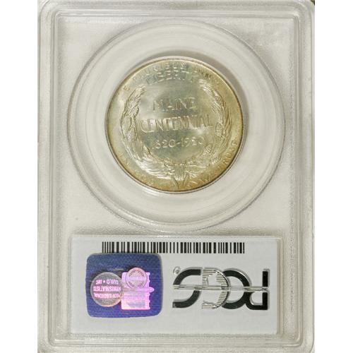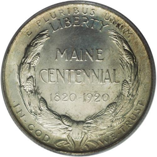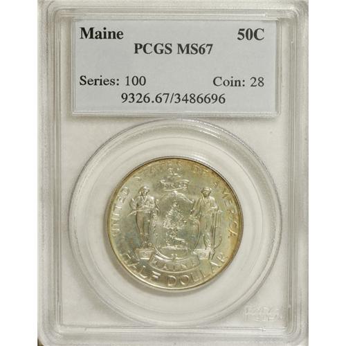 <B>1920 50C Maine MS67 PCGS.</B></I> The year before his Peace dollar design made its debut, Anthony de Francisci adapted a Harry H. Cochrane design and created the models for the Maine centennial commemorative. The carefully preserved Superb Gem offered here showcases the work of those two men. Crescents of golden-orange patina grace the right rim on each side of this otherwise silver-gray example. Population: 16 in 67, 0 finer (3/07).<BR><I>From The Cary & Cheryl Porter Collection.</B></I><BR><BR><b>Shipping:</b> Coins & Currency (<a target="_blank" href="http://www.heritageauctions.com/common/shipping.php">view shipping information</a>)