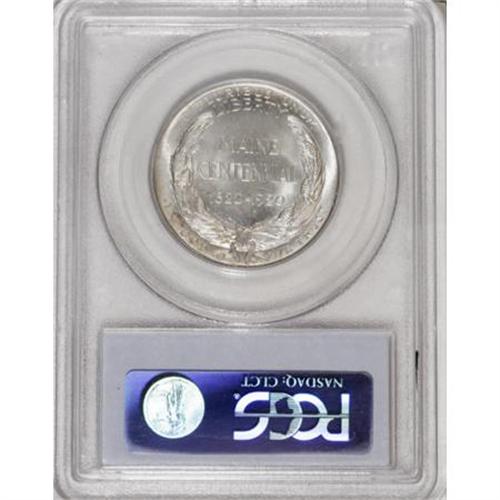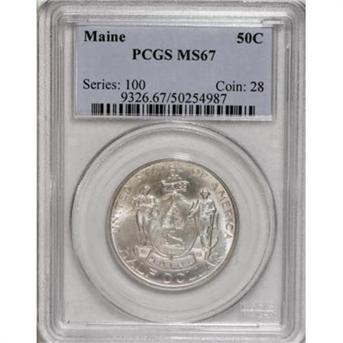 <B>1920 50C Maine MS67 PCGS.</B></I> Potent luster illuminates the sparkling surfaces of this conditionally scarce Superb Gem. Mostly untoned, with faint touches of speckled gold patina that become apparent under low magnification. Few examples of this early commemorative half dollar issue have survived in such a high state of preservation. Population: 16 in 67, 0 finer (12/07). <BR><BR><b>Shipping:</b> Coins & Currency (<a target="_blank" href="http://www.heritageauctions.com/common/shipping.php">view shipping information</a>)