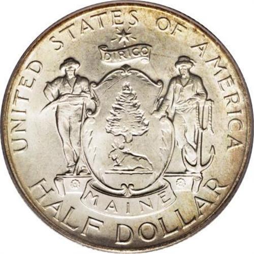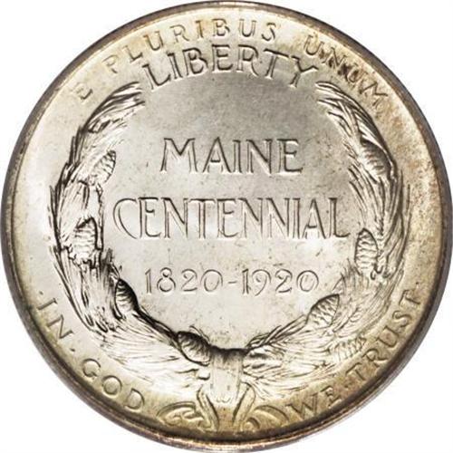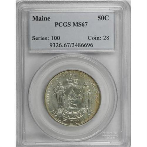 <B>1920 50C Maine MS67 PCGS.</B></I> The year before his Peace dollar design made its debut, Anthony de Francisci adapted a Harry H. Cochrane design and created the models for the Maine Centennial commemorative. The carefully preserved Superb Gem offered here showcases the work of those two men. Crescents of golden-orange patina grace the right rim on each side of this otherwise silver-gray example. Population: 16 in 67, 0 finer (3/08).<BR><BR><b>Shipping:</b> Coins & Currency (<a target="_blank" href="http://www.heritageauctions.com/common/shipping.php">view shipping information</a>)