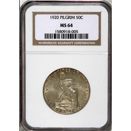 <B>1920 50C Pilgrim MS64 NGC.</B></I> NGC Census: (1830/1090). PCGS Population (1636/1149). Mintage: 152,112. Numismedia Wsl. Price for NGC/PCGS coin in MS64: $128. (#9359)<BR><BR><b>Shipping:</b> Coins & Currency (<a target="_blank" href="http://www.heritageauctions.com/common/shipping.php">view shipping information</a>\)