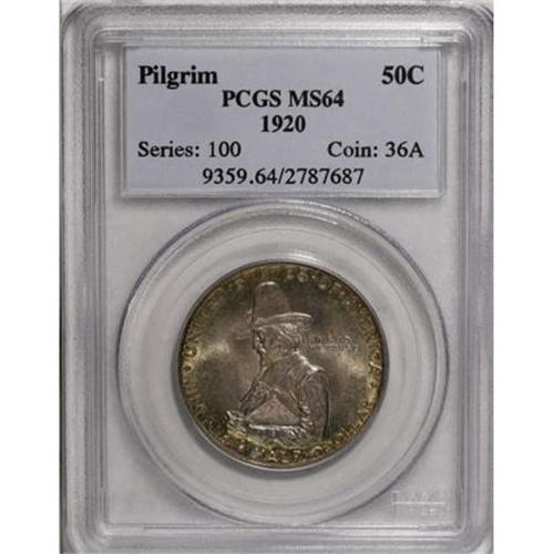 <B>1920 50C Pilgrim MS64 PCGS.</B></I> . PCGS Population (1678/1178). NGC Census: (1867/1107). Mintage: 152,112. Numismedia Wsl. Price for NGC/PCGS coin in MS64: $128. (#9359)<BR><BR><b>Shipping:</b> Coins & Currency (<a target="_blank" href="http://www.heritageauctions.com/common/shipping.php">view shipping information</a>)