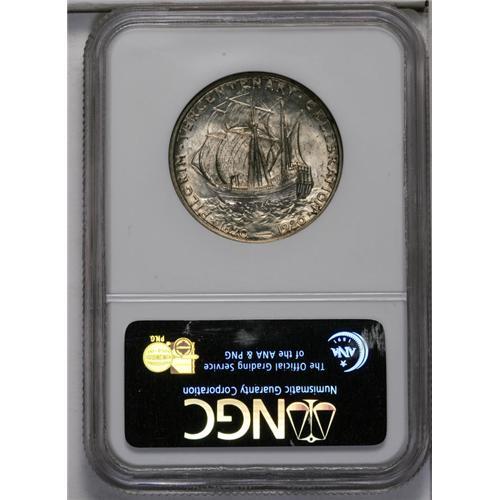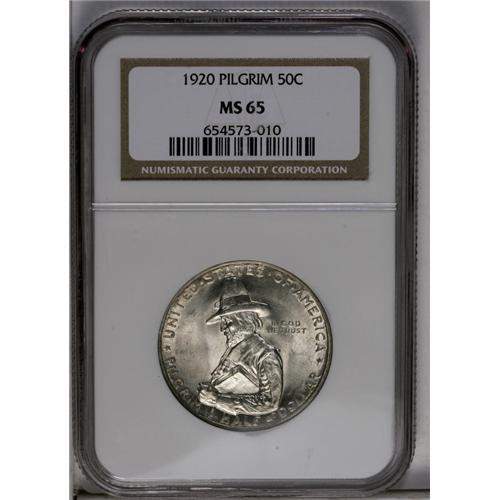 <B>1920<50C> Pilgrim MS65 NGC.</B></I> Superb mint luster covers the surfaces of this coin and a little natural color does not interrupt the bright sheen over both sides. Really a nice coin and one that should be considered by anyone needing this early commem.