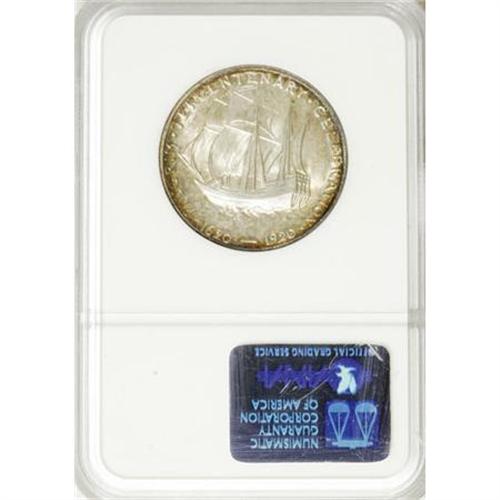 <B>1920 50C Pilgrim MS66 NGC.</B></I> An elegant commemorative of national importance, the Pilgrim program was the stage of a later money-grab with the issuance of 1921-dated pieces. This well-defined and shining first-year representative offers excellent eye appeal, with pastel gold and blue toning over the centers and crimson at the margins.<BR><BR><b>Shipping:</b> Coins & Currency (<a target="_blank" href="http://www.heritageauctions.com/common/shipping.php">view shipping information</a>)