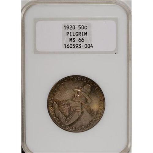 <B>1920 50C Pilgrim MS66 NGC.</B></I> A mix of red-brown and light green toning resides on the obverse, while dappled brown and ice-blue visit the reverse. Soft luster exudes from both sides, each of which is well preserved and exhibits sharply struck design elements.<BR><BR><b>Shipping:</b> Coins & Currency (<a target="_blank" href="http://www.heritageauctions.com/common/shipping.php">view shipping information</a>)