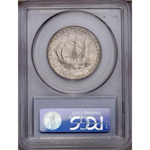 <B>1920<50C> Pilgrim MS66 PCGS.</B></I> Dusky toning subdues the otherwise impressive surfaces. Frosty luster remains visible on each side with sharp design elements throughout.