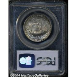 <table><tr><td><table><tr><td>1920 50C Pilgrim MS66 PCGS. Fully struck and lustrous, with beautiful rainbow toning near the borders, and well preserved surfaces that only show a few wispy blemishes, on the upper obverse. Slender charcoal-gray toning streaks, on each side, invest the coin with a somber, still highly attractive appearance. <BR><BR><B>Important notice:</B> Heritage usually auctions material at the rate of 200-250 lots per hour. On some occasions eBay Live bid software or the Internet may not be able to keep up with the pace of the auction. We recommend placing a realistic absentee bid now as insurance to avoid disappointment. Occasionally the auctioneer may eliminate or reject an eBay Live bid, and the auctioneer may also reopen a lot after the close of the eBay live bidding (usually because we missed an audience bid), and may reject your bid even if it shows you as the winning bidder. By bidding via eBay Live, you agree that Heritage may award the lot to another bidder at its sole discretion under the circumstances described above or any other reasonable circumstances. Since eBay bids are not shown to us until we open the lot on the floor, we treat those bids just like floor bids. In most cases the floor responds before the eBay bid is presented to us, due to Internet lag time, so for consistency we have made it a policy that floor bids are always considered first over tie eBay live bids. Also please note that all Heritage lots purchased through eBay Live carry a 20% Buyer's Premium. Please make sure you read the Terms and Conditions before you bid. <BR><BR><B>IMPORTANT ANNOUNCEMENT ABOUT RESERVES:</B> Heritage now divulges all reserves on its web site 7 days before every auction. If you want to know whether the reserve on this lot has been met, and if not, what the reserve amount is, please visit this lot page on the HeritageCoin.com web site, or email: bid@HeritageGalleries.com </span></font></td></tr></table></td></tr></table>