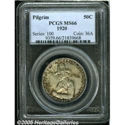 <B>1920 50C Pilgrim MS66 PCGS.</B></I> Splotches of magenta and gold-brown patina rest over lustrous surfaces that are magnificently preserved.