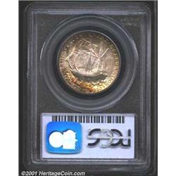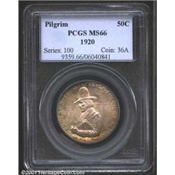 1920 50C Pilgrim MS66 PCGS. The lavender-tinged centers are framed by bright peripheral gold, green and violet patina. Lustrous with a very good strike and nearly pristine surfaces. The arm of the pilgrim has multiple spindly die cracks, as struck.From the Ric Leichtung Collection. Important notice: We expect to be auctioning lots at the rate of 200-250 per hour. Sometimes eBay Premier live bid software cannot keep up with that pace, so we strongly recommend that you place a realistic proxy bid now as insurance to avoid disappointment. Also please note that all Heritage/CAA lots purchased through eBay Premier carry a 20% Buyer's Premium.