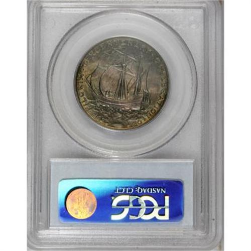 <B>1920 50C Pilgrim MS66 PCGS.</B></I> A strongly lustrous and heavily toned Premium Gem, boldly impressed overall with particularly strong detail on the often-weak ship's sails. Both sides offer gold-orange and sea-green patina with a touch of mauve.<BR><BR><b>Shipping:</b> Coins & Currency (<a target="_blank" href="http://www.heritageauctions.com/common/shipping.php">view shipping information</a>)
