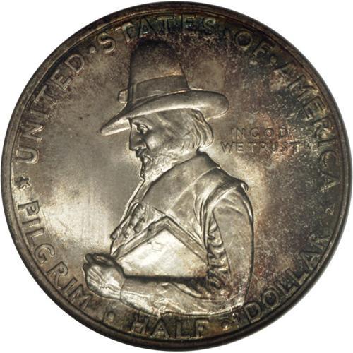 <B>1920 50C Pilgrim MS67 NGC.</B></I> An attractive example that sports subtle detail on the pilgrim's cuff and tome and on the ship's sails. On the reverse, thin golden toning at the rims surrounds a highly lustrous and untoned center, while violet, rose, and orange patina covers the periphery and right obverse field. Census: 13 in 67, 0 finer (11/06).<BR><BR><b>Shipping:</b> Coin/Currency (<a target="_blank" href="http://www.heritageauctions.com/common/shipping.php">view shipping information</a>) <BR><BR><B>Important noti