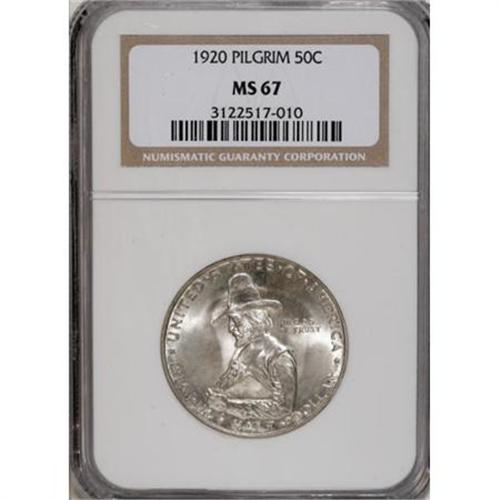 <B>1920 50C Pilgrim MS67 NGC.</B></I> On this delightful Superb Gem, practically pristine surfaces are highly lustrous and pleasing. The strike is bold with only slight weakness at the peripheries. Close inspection reveals very few marks, and the surfaces show virtually no toning. Neither PCGS nor NGC has graded a higher grade example (11/07), and it would be difficult to imagine what a finer example would look like.<BR><BR><b>Shipping:</b> Coins & Currency (<a target="_blank" href="http://www.heritageauctions.com/common/shipping.php">view shipping information</a>)