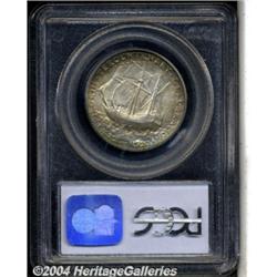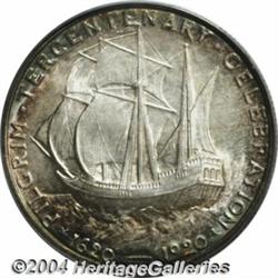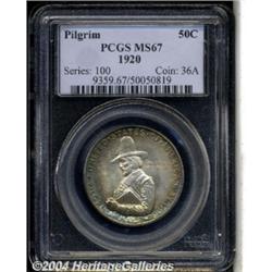 <B>1920<50C> Pilgrim MS67 PCGS.</B></I> Superb quality and virtually untouched on either side by coin-to-coin contact. Most of each side retains original mint brilliance and are surrounded by golden-brown and sea-green toning around the margins. Simply outstanding and unsurpassed in grade at either service. Population: 21 in 67, 0 finer (3/04). <BR><BR><B>Important notice:</B> Heritage usually auctions material at the rate of 200-250 lots per hour. On some occasions eBay Live bid software or the Internet may not be able to keep up with the pace of the auction. We recommend placing a realistic absentee bid now as insurance to avoid disappointment. Occasionally the auctioneer may eliminate or reject an eBay Live bid, and the auctioneer may also reopen a lot after the close of the eBay live bidding (usually because we missed an audience bid), and may reject your bid even if it shows you as the winning bidder. By bidding via eBay Live, you agree that Heritage may award the lot to another bidder at its sole discretion under the circumstances described above or any other reasonable circumstances. Since eBay bids are not shown to us until we open the lot on the floor, we treat those bids just like floor bids. In most cases the floor responds before the eBay bid is presented to us, due to Internet lag time, so for consistency we have made it a policy that floor bids are always considered first over tie eBay live bids. Also please note that all Heritage lots purchased through eBay Live carry a 20% Buyer's Premium. Please make sure you read the Terms and Conditions before you bid. </span></font></tr></table></td></tr></table>