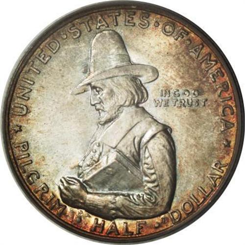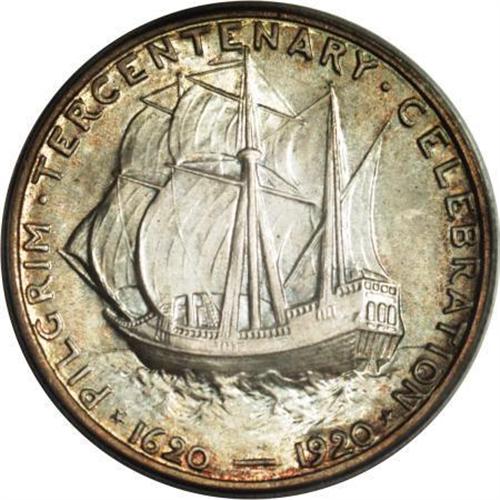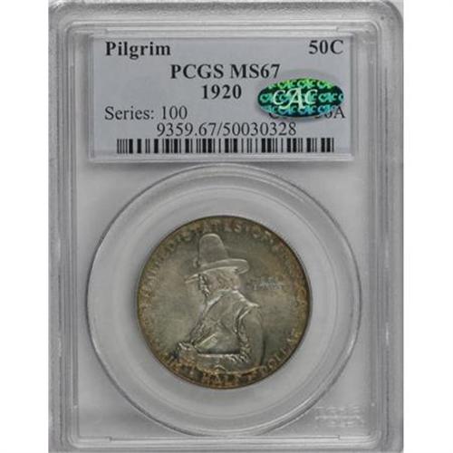 <B>1920 50C Pilgrim MS67 PCGS. CAC.</B></I> The series enthusiast should find plenty to admire about this top-notch 1920 Pilgrim half. The strike is crisp, particularly on the often-nonexistent clasp on the Bible, and each side has vibrant luster beneath pastel silver-blue and gold toning that deepens to reddish-orange at the margins. A wonderfully appealing coin, tied with 30 others for the finest graded by PCGS (3/08).<BR><I>From The Good Humor Collection.</B></I><BR><BR><b>Shipping:</b> Coins & Currency (<a target="_blank" href="http://www.heritageauctions.com/common/shipping.php">view shipping information</a>)
