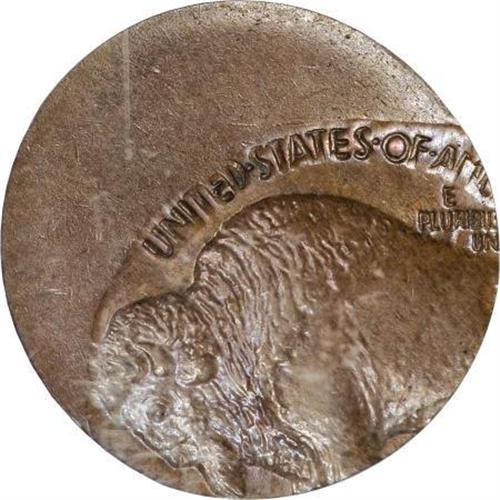 <B>1920-? 5C Buffalo Nickel--40% Off Center on Cent Planchet--MS64 Brown PCGS.</B></I> Struck widely off center toward 2 o'clock. A lustrous and exquisitely struck golden-brown example. The Indian's profile and the bison's legs are off the flan. The date is present, but not the mintmark (if any). The struck portion of the coin is well preserved, although the unstruck half of the obverse has a couple of minor mint-made abrasions. Because the piece is off center, the braid and shoulder definition is unusually intricate for a business strike. An Uncirculated (and popular) obsolete type coin with two significant mint errors.<BR><BR><b>Shipping:</b> Coins & Currency (<a target="_blank" href="http://www.heritageauctions.com/common/shipping.php">view shipping information</a>)