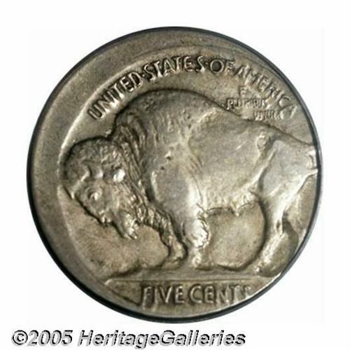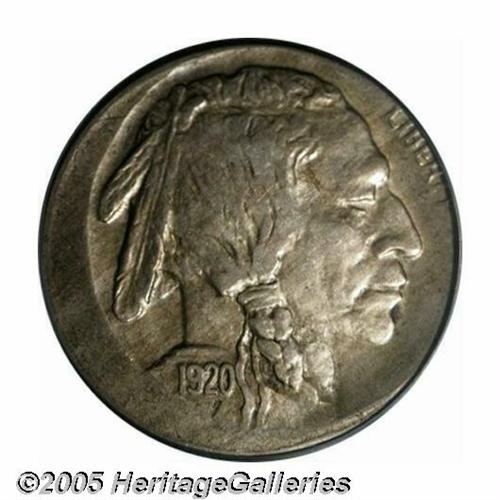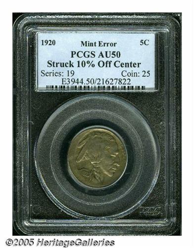 <B>1920<5C> Buffalo Nickel--Struck 10% Off Center--AU50 PCGS.</B></I> This high mintage issue appears to be more susceptible to off-center errors than most in the Buffalo series. The devices here are tilted toward 2 o'clock and keep enough of the image that the date and mintmark (or lack of it) are certain.<BR><I>From The Larry Rausch Collection, Part Five.</B></I>