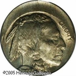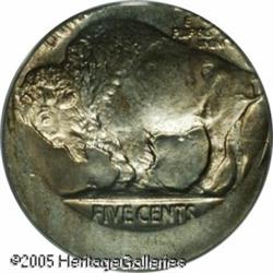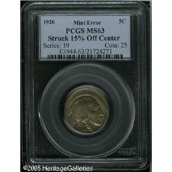 <B>1920 5C Buffalo Nickel--Struck 15% Off Center--MS63 PCGS.</B></I> Struck off center at 6 o'clock. Lovely light gold toning over frosty mint luster. An excellent example with strong design features.<BR><I>From The Larry Rausch Collection, Part Three.</B></I> Lot:10948