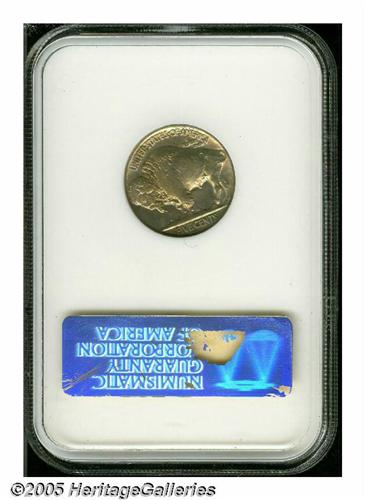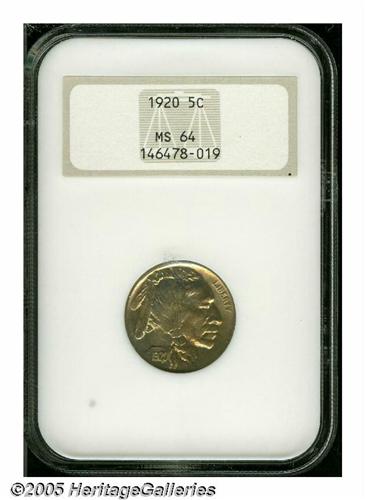 <B>1920<5C> MS64 NGC.</B></I> Luminous honey-gold colors swirl about this lustrous near-Gem. Virtually free from contact, although the centers have a typical strike and a small toning spot is under the bison's chin. Some counterclockwise die rotation is also noted.