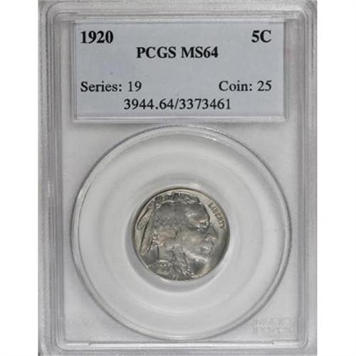 <B>1920 5C MS64 PCGS.</B></I> PCGS Population (423/336). NGC Census: (295/116). Mintage: 63,093,000. Numismedia Wsl. Price for NGC/PCGS coin in MS64: $196. (#3944)<BR><BR><B>Coin Engraver:</B> James E. Fraser<BR><BR><b>Shipping:</b> Coins & Currency (<a target="_blank" href="http://www.heritageauctions.com/common/shipping.php">view shipping information</a>)