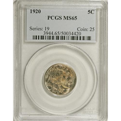 <B>1920 5C MS65 PCGS.</B></I> Washes of violet-blue and golden patina grace each side of this shining Gem. Aside from a touch of softness at the shoulder, this coin has above-average detail overall.<BR><BR><b>Shipping:</b> Coins & Currency (<a target="_blank" href="http://www.heritageauctions.com/common/shipping.php">view shipping information</a>)