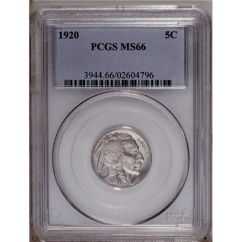 <B>1920<5C> MS66 PCGS.</B></I> A faint veneer of champagne color with a splash or two of powder-blue overlays well preserved, lustrous surfaces. The design elements are well defined except for the bison's tail. Population: 97 in 66, 8 finer (3/06). <BR><BR><B>Important notice:</B> Heritage usually auctions material at the rate of 200-250 lots per hour. On some occasions eBay Live bid software or the Internet may not be able to keep up with the pace of the auction. We recommend placing a realistic absentee bid now as insurance to avoid disappointment. Occasionally the auctioneer may eliminate or reject an eBay Live bid, and the auctioneer may also reopen a lot after the close of the eBay live bidding (usually because we missed an audience bid), and may reject your bid even if it shows you as the winning bidder. By bidding via eBay Live, you agree that Heritage may award the lot to another bidder at its sole discretion under the circumstances described above or any other reasonable circumstances. Since eBay bids are not shown to us until we open the lot on the floor, we treat those bids just like floor bids. In most cases the floor responds before the eBay bid is presented to us, due to Internet lag time, so for consistency we have made it a policy that floor bids are always considered first over tie eBay live bids. Also please note that all Heritage lots purchased through eBay Live carry a 20% Buyer's Premium. Please make sure you read the Terms and Conditions before you bid. This lot is being auctioned in conjunction with a live floor auction by Heritage Galleries & Auctioneers. All final auction and invoice information will be supplied by Heritage Galleries & Auctioneers, and all other information should be considered preliminary. Lot:1065 <BR><BR><B>Winning Notification and Billing:</B> After the FINAL session in this auction is complete, Heritage will send e-mail and snail mail invoices. This process normally takes several days. All final auction and invoice information will be supplied by Heritage Galleries & Auctioneers, and all other information should be considered preliminary. <BR><BR>This auction will be conducted on a live auction floor and over the Internet through eBay Live. If you choose to place an absentee bid, please take a moment to <font color='#0000ff'><u><a href='http://pages.ebay.com/liveauctions/help/before/laabsentee.html'>learn how eBay Live absentee bidding works</a></u></font><font color='#000000'>