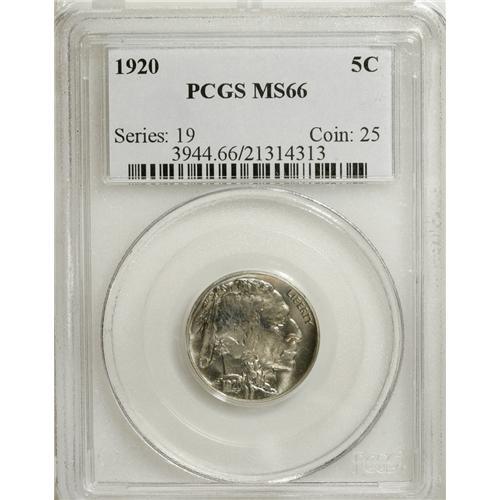 <B>1920 5C MS66 PCGS.</B></I> Powder-blue, gold, and apricot hues enrich this shimmering and nearly unabraded Premium Gem. The strike is strong for the type, although the centers are not completely brought up. PCGS has only certified eight better ones in more than 20 years of coin certification (4/07).<BR><BR><b>Shipping:</b> Coins & Currency (<a target="_blank" href="http://www.heritageauctions.com/common/shipping.php">view shipping information</a>)