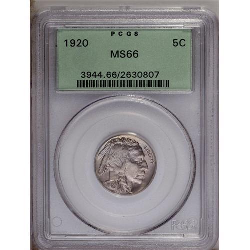 <B>1920<5C> MS66 PCGS.</B></I> Sky-blue and chestnut shades embrace this nicely struck and undisturbed high grade Buffalo Nickel. Housed in a green label holder. PCGS and NGC combined have certified a mere 11 pieces finer.