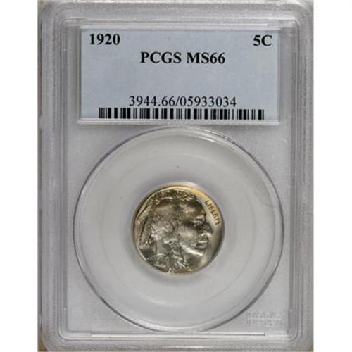 <B>1920 5C MS66 PCGS.</B></I> A lovely example of this postwar issue, solidly struck with swirling luster and colorful patina. Ice-blue patina graces the centers, while deeper green-gold toning is present at the margins. PCGS has graded just eight coins finer (7/07).<BR><BR><B>Coin Engraver:</B> James E. Fraser<BR><BR><b>Shipping:</b> Coins & Currency (<a target="_blank" href="http://www.heritageauctions.com/common/shipping.php">view shipping information</a>)