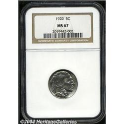 <B>1920<5C> MS67 NGC.</B></I> While the 1920-P (63 million pieces produced) is a plentiful Buffalo Nickel in terms of total number of coins known, it is a rare issue at the Superb Gem level of preservation. Simply put, this is the most exquisite 1920 Nickel that this cataloger has handled. Untoned with a bright, lustrous sheen, the surfaces exhibit overall sharp striking definition that further enhances the already memorable eye appeal. Expertly preserved with nary a bothersome handling mark to report. NGC and PCGS combined report a mere six examples in MS67, and none are finer (3/04). <BR><BR><B>Important notice:</B> Heritage usually auctions material at the rate of 200-250 lots per hour. On some occasions eBay Live bid software or the Internet may not be able to keep up with the pace of the auction. We recommend placing a realistic absentee bid now as insurance to avoid disappointment. Occasionally the auctioneer may eliminate or reject an eBay Live bid, and the auctioneer may also reopen a lot after the close of the eBay live bidding (usually because we missed an audience bid), and may reject your bid even if it shows you as the winning bidder. By bidding via eBay Live, you agree that Heritage may award the lot to another bidder at its sole discretion under the circumstances described above or any other reasonable circumstances. Since eBay bids are not shown to us until we open the lot on the floor, we treat those bids just like floor bids. In most cases the floor responds before the eBay bid is presented to us, due to Internet lag time, so for consistency we have made it a policy that floor bids are always considered first over tie eBay live bids. Also please note that all Heritage lots purchased through eBay Live carry a 20% Buyer's Premium. Please make sure you read the Terms and Conditions before you bid.