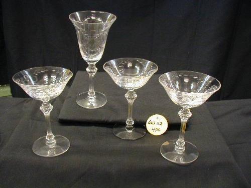 1920 AMERICAN CUT ELEGANT STEMWARE FEATURING CROSSES & WREATHS W/DRAPING FOSTORIA? INCLUDES (1) 8in WATER, (3) 5 3/4in WINES (ALL W/FLEA FLAKE) 4 PC