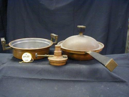 1920 ARTS & CRAFTS COPPER & WOOD 4 PC CHAFING DISH W/BURNER S. STERNAU & CO N.Y. 9 5/8inDIA., 4 PC