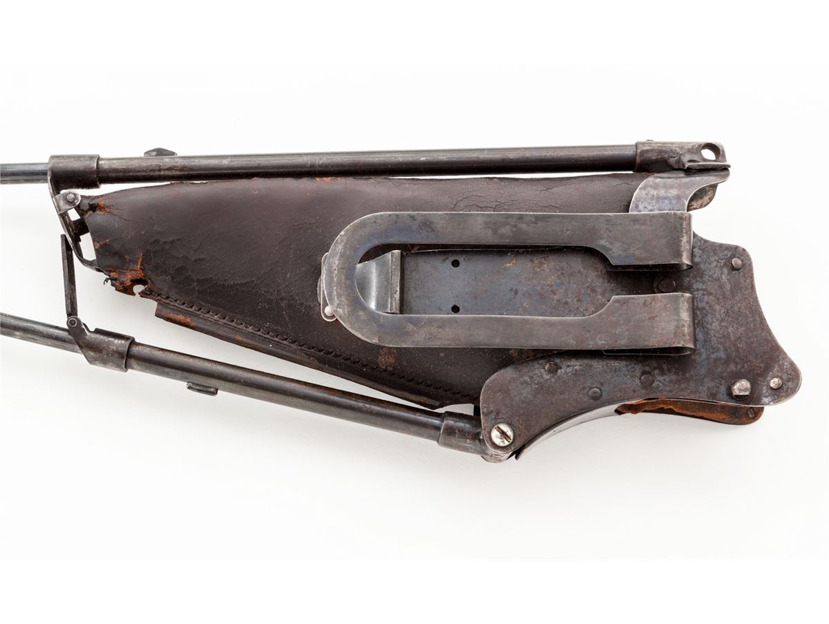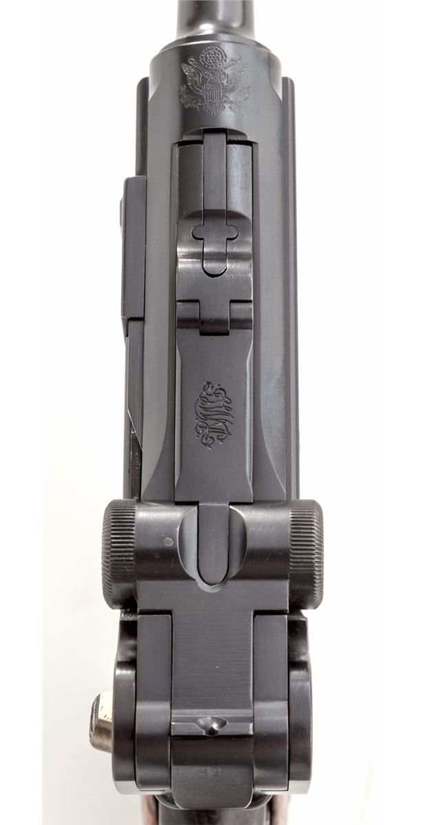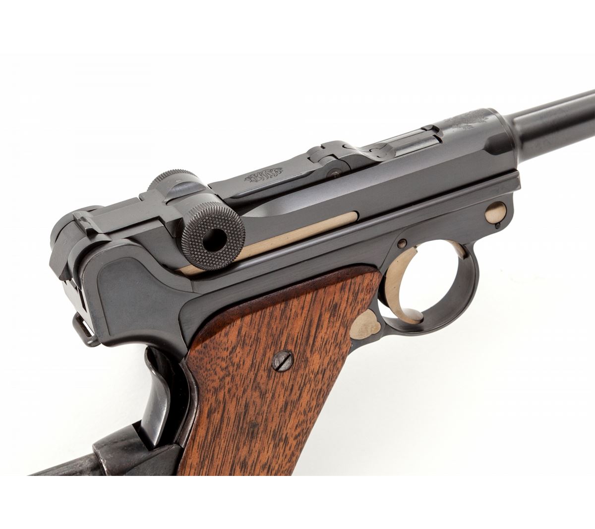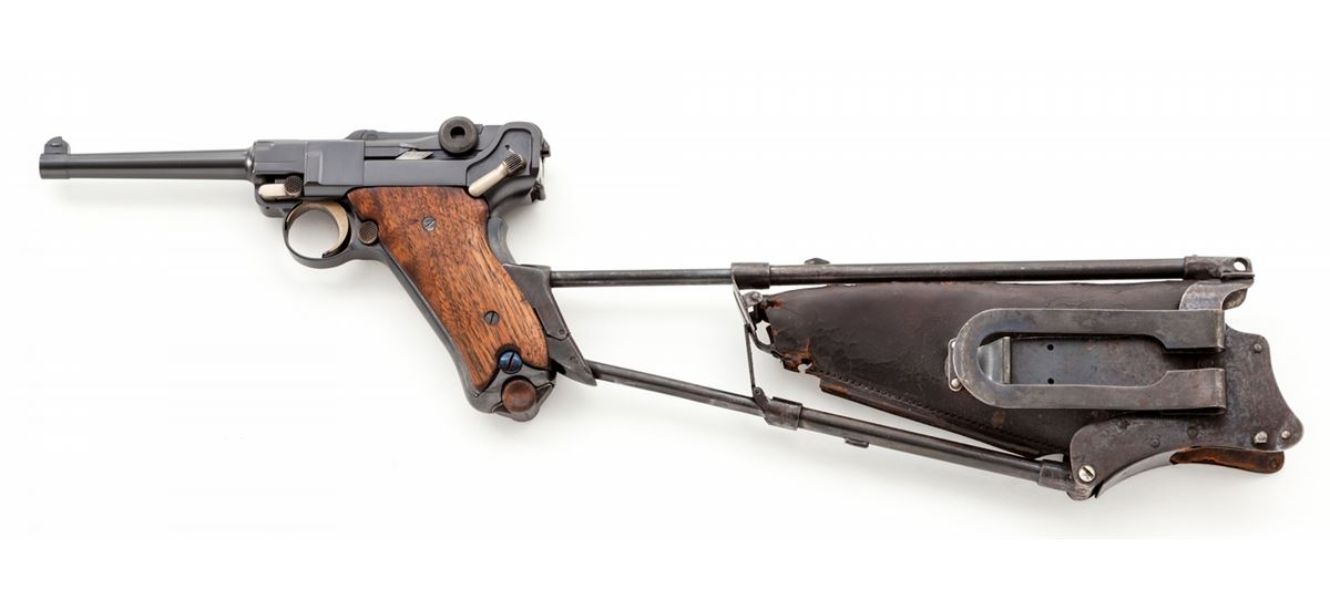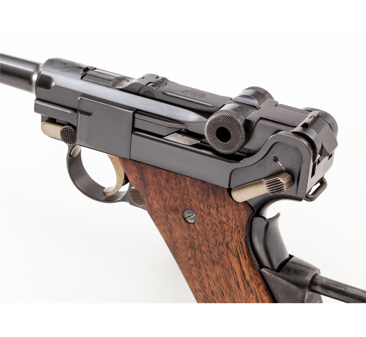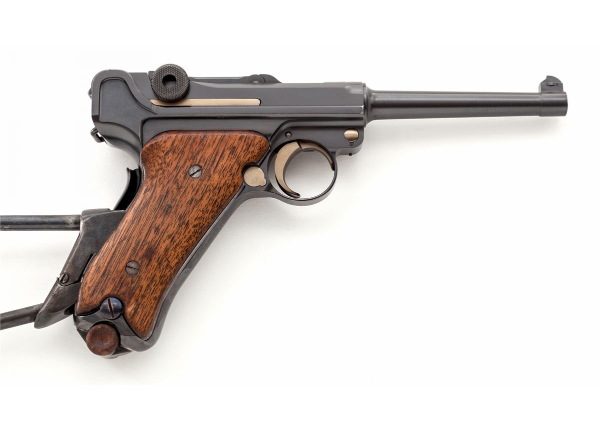 1920 American Eagle Luger, with Combination Ideal Shoulder Stock and Holster, #45842, .30 Luger cal., 4-3/4'' barrel, blue finish with straw small parts, Ideal smooth wood grips with adapters. Chamber with American eagle, DWM to central toggle link, lower portion of thumb safety polished bright, extractor marked Loaded, and marked ''Germany'' just below serial number on forward portion of frame. Condition is excellent as restored, retaining approx. 97% correct rust blue. Straw parts are excellent. Grips small nicks and losses. Bore with light frosting in the grooves. Shoulder stock with separation of leather from metal skeleton near muzzle, and missing three small screws at rear. Est.: $1,200-$1,800. (C&R)