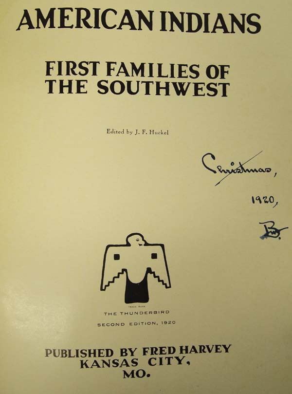 1920 American Indians: First Families of the Southwest Edited by J. F. Huckel, Softback Book, c. 1920 Published by Fred Harvey Kansas City, MO., paper on spine is missing