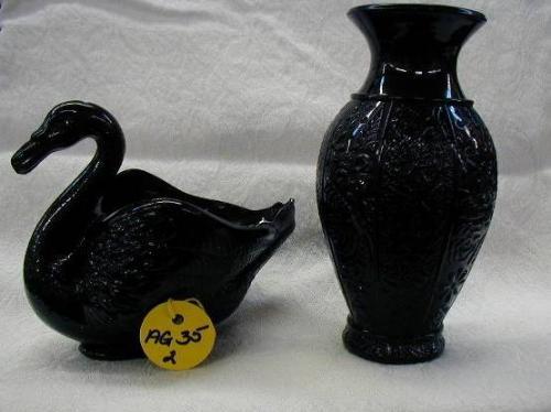 1920 BLACK AMETHYST PRESSED ART GLASS INCLUDES (1) 5in VASE, (1) 4in X 5in SWAN 2PC EXCELLENT