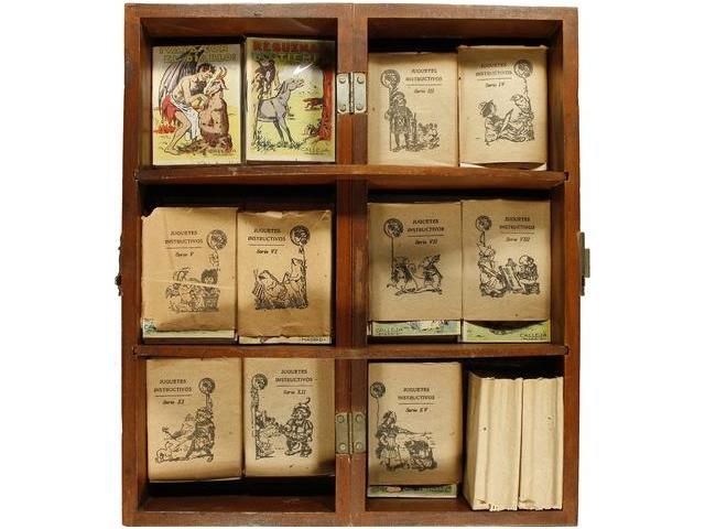 1920 CA. LIBRO: (INFANTIL). JUGUETES INSTRUCTIVOS. EDITORIAL CALLEJA. Colección completa de 15 series, de 20 cuentos c/u de 16 p. Ediciones de pequeñas dimensiones de 7 x 3 cm. Con portadas litográficas en color, todas (a excepción de las 2 primeras series) conservan las fundas edit. originales. Presentadas en una caja de madera de Biblioteca Calleja.