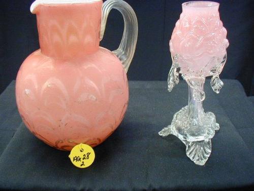 1920 CRANBERRY ART GLASS INCLUDES (1) 6 3/4in PITCHER IRIDESCENT CRANBERRY WAVE PATTERN OVER WHITE CASED LINING CLEAR HND. (GLASS HAS THINNED RESULTING IN POPS), (1) 6 1/2in BULB VASE HND. BLWN. (W/ 1 DROP BROKEN), 2 PC