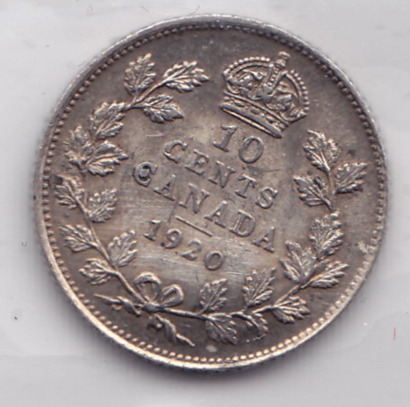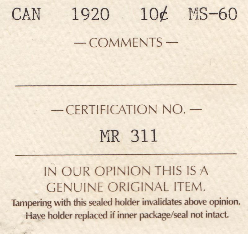 1920 Canadian Silver 10-Cent Dime Coin - Graded By ICCS MS-60 (MR 311)