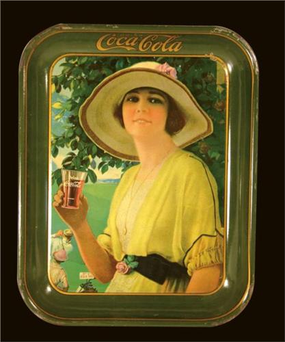 1920 Coca Cola Tin Serving Tray. Paint chip at 1:00, scratches on rim and 3 inch surface scratch above glass otherwise excellent condition. 10 1/2 X 13 1/4 inches.