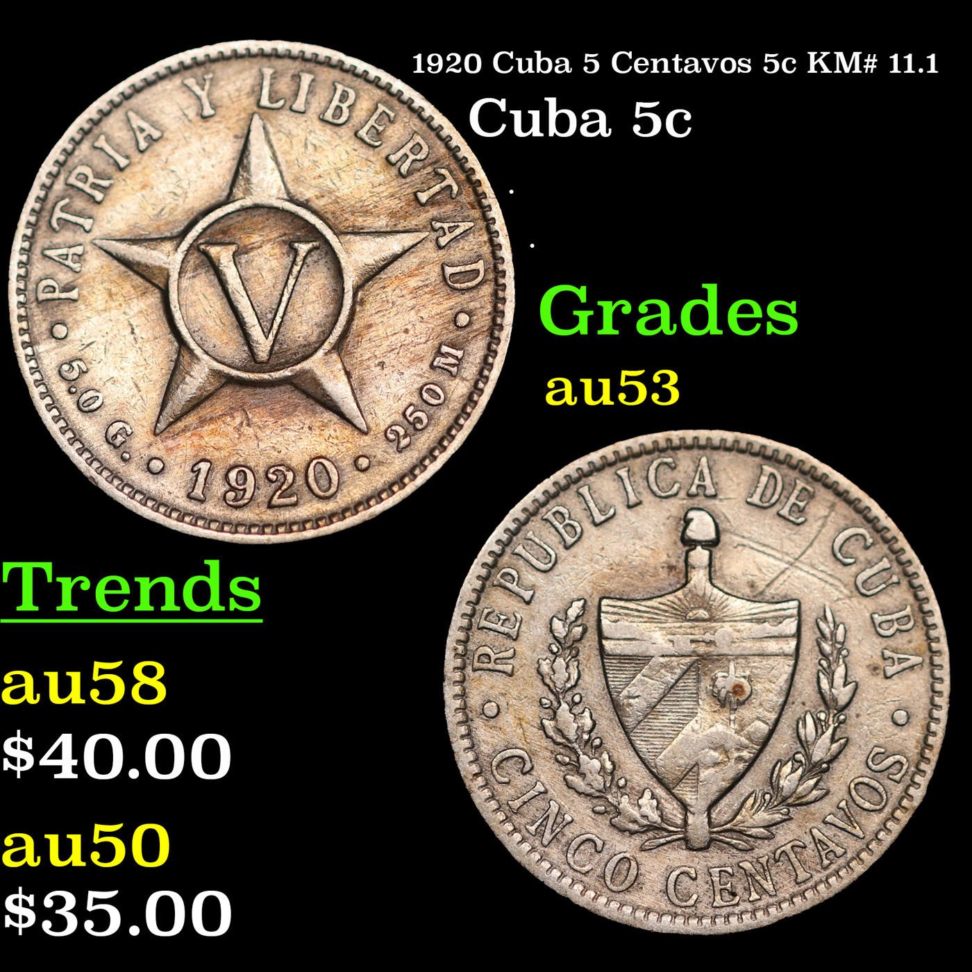 1920 Cuba 5 Centavos 5c KM# 11.1 Grades Select AU.
