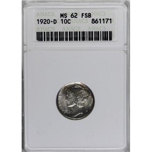 <B>1920-D 10C MS62 Full Bands ANACS.</B></I> NGC Census: (23/93). PCGS Population (17/197). Mintage: 19,171,000. Numismedia Wsl. Price for NGC/PCGS coin in MS62: $325. (#4931)<BR><BR><B>Coin Engraver:</B> Adolph A. Weinman<BR><BR><b>Shipping:</b> Coins & Currency (<a target="_blank" href="http://www.heritageauctions.com/common/shipping.php">view shipping information</a>)