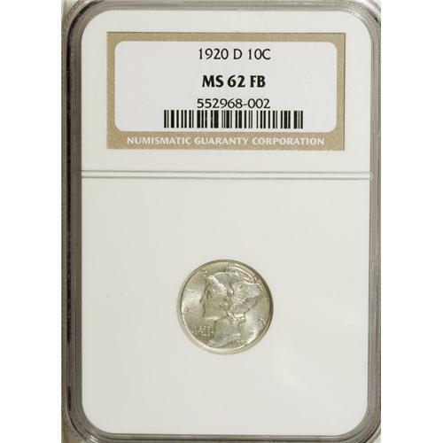 <B>1920-D 10C MS62 Full Bands NGC.</B></I> NGC Census: (46/186). PCGS Population (16/189). Mintage: 19,171,000. Numismedia Wsl. Price for NGC/PCGS coin in MS62: $300. (#4931)<BR><BR><b>Shipping:</b> Coins & Currency (<a target="_blank" href="http://www.heritageauctions.com/common/shipping.php">view shipping information</a>)