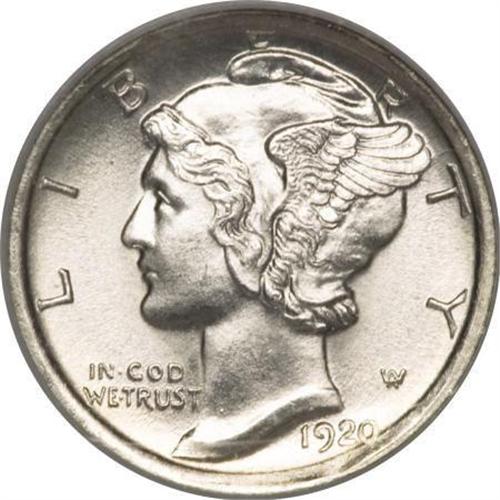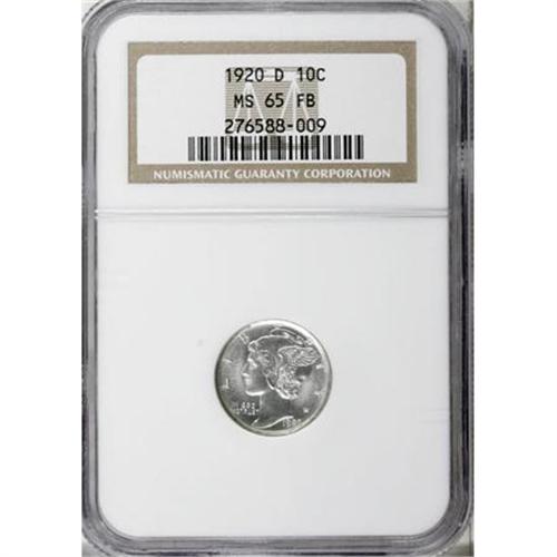 <B>1920-D 10C MS65 Full Bands NGC.</B></I> This charming example of a semikey Mercury dime issue offers a stone-white obverse with a reverse tinged with champagne-pink, and both sides display deep, satisfying mint frost. All of the fasces are well detailed, not just the central bands but the verticals and diagonals as well. An elusive issue, seldom seen finer. Census: 13 in 65 Full Bands, 6 finer (3/08).<BR><BR><B>Coin Engraver:</B> Adolph A. Weinman<BR><BR><b>Shipping:</b> Coins & Currency (<a target="_blank" href="http://www.heritageauctions.com/common/shipping.php">view shipping information</a>)