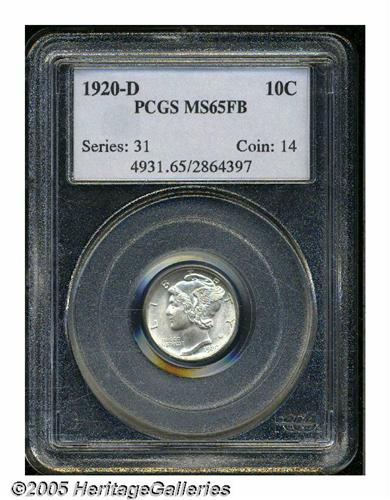 <B>1920-D<10C> MS65 Full Bands PCGS.</B></I> Very well struck in the border areas as well as the horizontal crossbands at the center of the reverse. The satiny surfaces are essentially brilliant and display traces of die clashing on the reverse. Population: 37 in 65, 15 finer (6/05).