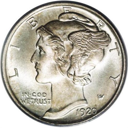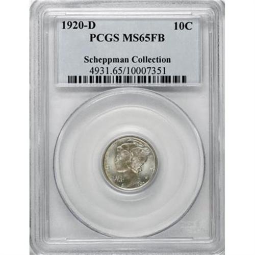<B>1920-D 10C MS65 Full Bands PCGS.</B></I> Ex: Bassano Collection. A magnificent representative of this elusive Denver dime issue, boldly defined with splashes of peach and silver-blue patina over each side. Gems prove challenging in any form, and the Full Bands status of the piece offered here makes it particularly noteworthy. Population: 42 in 65 Full Bands, 18 finer (12/07).<BR><I>From The Scheppman Collection, #4 PCGS Registry of Full Band Mercury Dimes.</B></I><BR><BR><B>Coin Engraver:</B> Adolph A. Weinman<BR><BR><b>Shipping:</b> Coins & Currency (<a target="_blank" href="http://www.heritageauctions.com/common/shipping.php">view shipping information</a>)