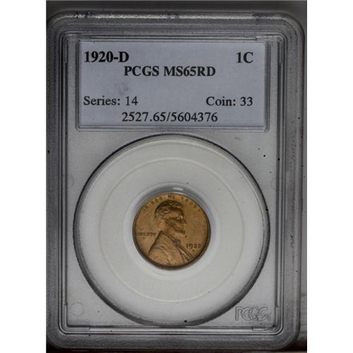<B>1920-D<1C> MS65 Red PCGS.</B></I> A mostly golden-orange example with slight olive undertones on the reverse. An attractive Gem with above-average striking detail for this long-overlooked branch mint issue. Virtually unblemished, with scattered flyspecks on each side. Population: 84 in 65, 3 finer (3/06).<BR><I>From The Kendall Marie #4 All-Time Finest PCGS Registry of Lincoln Cents with Varieties, Circulation Strikes, 1909-1958.</B></I> <BR><BR><B>Important notice:</B> Heritage usually auctions material at the rate of 200-250 lots per hour. On some occasions eBay Live bid software or the Internet may not be able to keep up with the pace of the auction. We recommend placing a realistic absentee bid now as insurance to avoid disappointment. Occasionally the auctioneer may eliminate or reject an eBay Live bid, and the auctioneer may also reopen a lot after the close of the eBay live bidding (usually because we missed an audience bid), and may reject your bid even if it shows you as the winning bidder. By bidding via eBay Live, you agree that Heritage may award the lot to another bidder at its sole discretion under the circumstances described above or any other reasonable circumstances. Since eBay bids are not shown to us until we open the lot on the floor, we treat those bids just like floor bids. In most cases the floor responds before the eBay bid is presented to us, due to Internet lag time, so for consistency we have made it a policy that floor bids are always considered first over tie eBay live bids. Also please note that all Heritage lots purchased through eBay Live carry a 20% Buyer's Premium. Please make sure you read the Terms and Conditions before you bid. This lot is being auctioned in conjunction with a live floor auction by Heritage Galleries & Auctioneers. All final auction and invoice information will be supplied by Heritage Galleries & Auctioneers, and all other information should be considered preliminary. Lot:501 <BR><BR><B>Winning Notification and Billing:</B> After the FINAL session in this auction is complete, Heritage will send e-mail and snail mail invoices. This process normally takes several days. All final auction and invoice information will be supplied by Heritage Galleries & Auctioneers, and all other information should be considered preliminary. <BR><BR>This auction will be conducted on a live auction floor and over the Internet through eBay Live. If you choose to place an absentee bid, please take a moment to <font color='#0000ff'><u><a href='http://pages.ebay.com/liveauctions/help/before/laabsentee.html'>learn how eBay Live absentee bidding works</a></u></font><font color='#000000'>