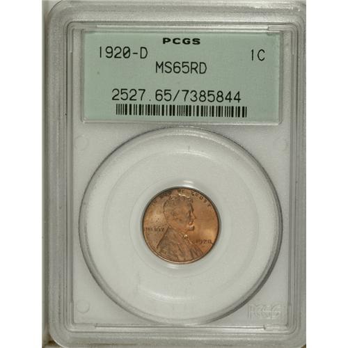 <B>1920-D 1C MS65 Red PCGS.</B></I> Housed in an old green-label holder, this delightful Gem has fully brilliant red luster with just a few small flecks and insignificant wispy toning. A scratch on the reverse of the holder has no bearing on the coin.<BR><BR><b>Shipping:</b> Coin/Currency (<a target="_blank" href="http://www.heritageauctions.com/common/shipping.php">view shipping information</a>)